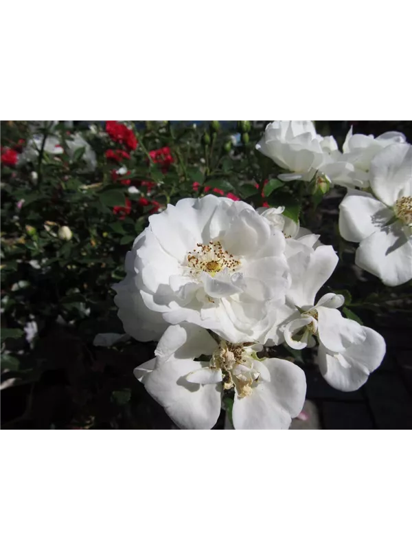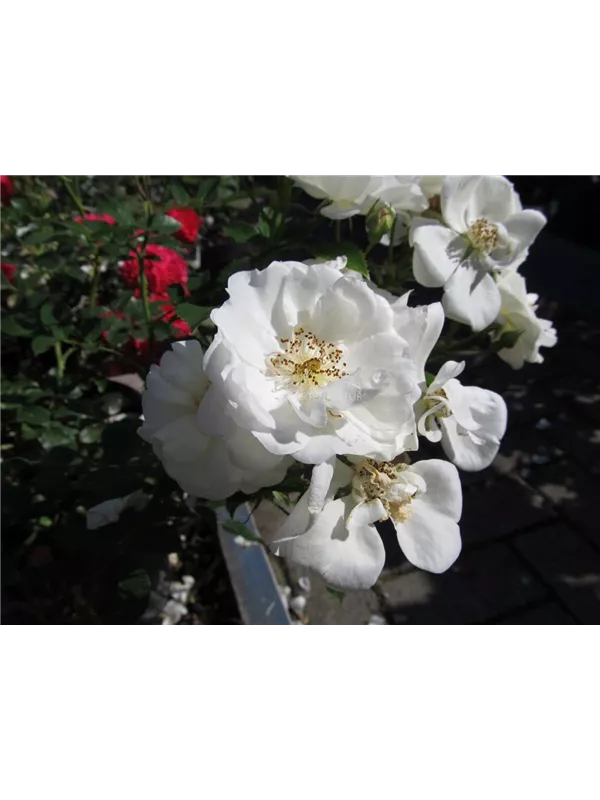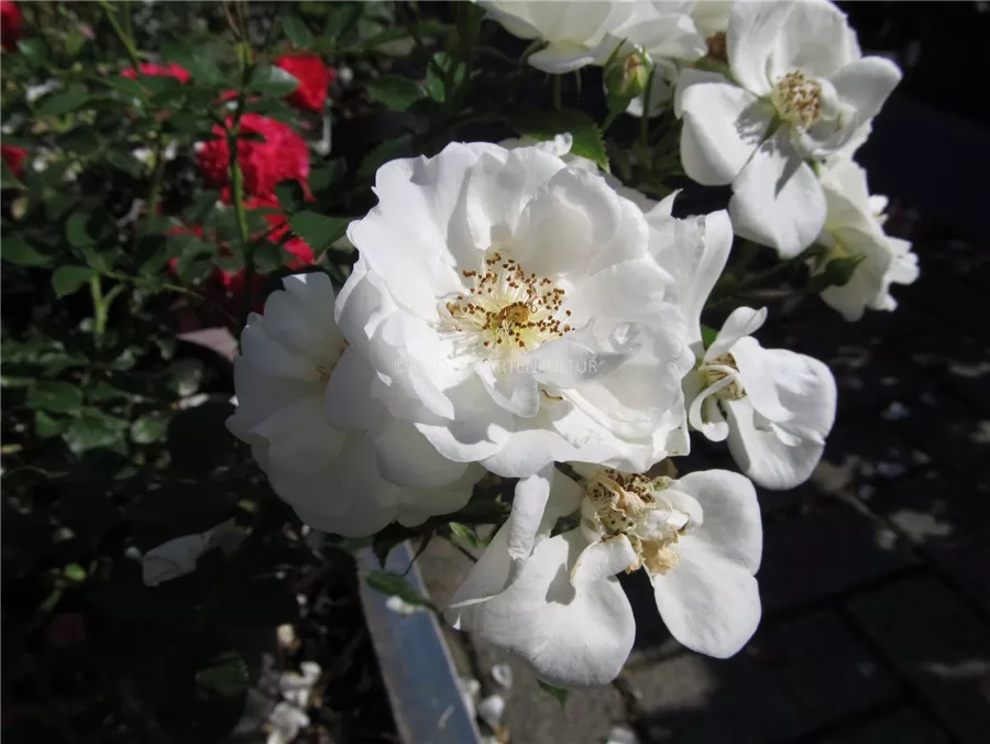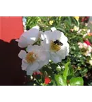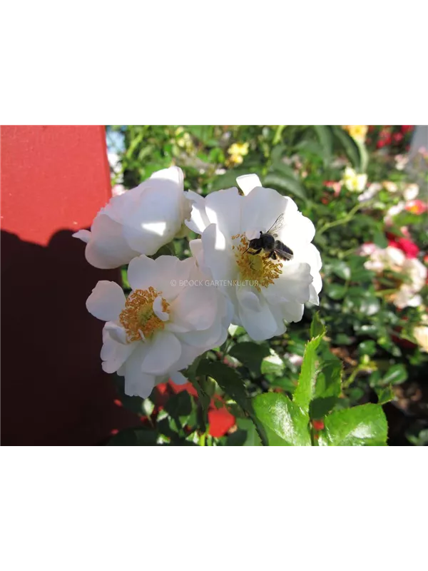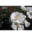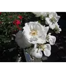 Die weißen, halbgefüllten, schalenförmigen Blüten der Beetrose 'Innocencia'® erscheinen in Dolden von Juni bis September. Diese werden etwa 4 - 5 cm groß und sind leicht duftend.