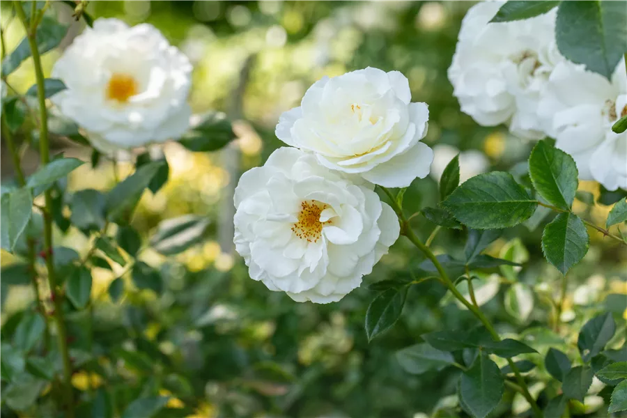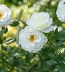 Die Beetrose 'Kristall' bildet weiße, duftende, gefüllte Blüten von Juni bis September.