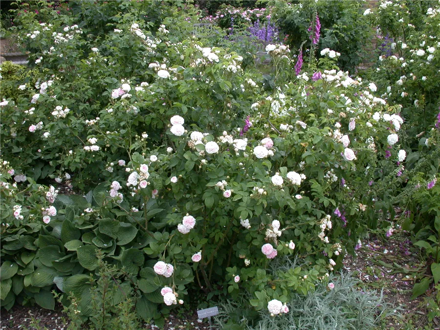 Die Strauchrose 'Felicite Parmentier' setzt schöne Akzente gemeinsam mit: