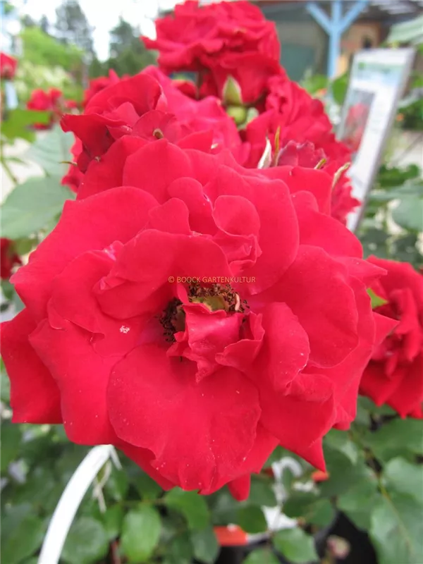 Die dunkelroten, schalenförmigen Blüten der Beetrose 'Nina Weibull'® erscheinen in Dolden von Juni bis September.