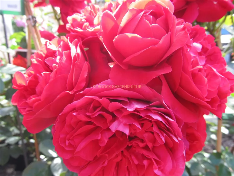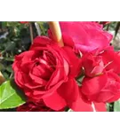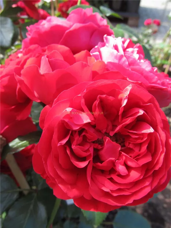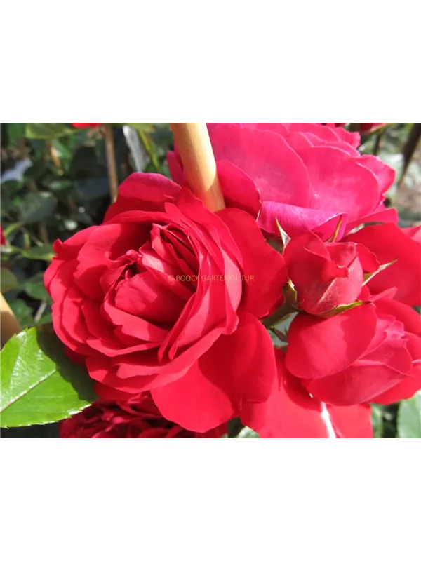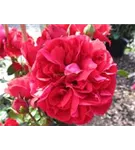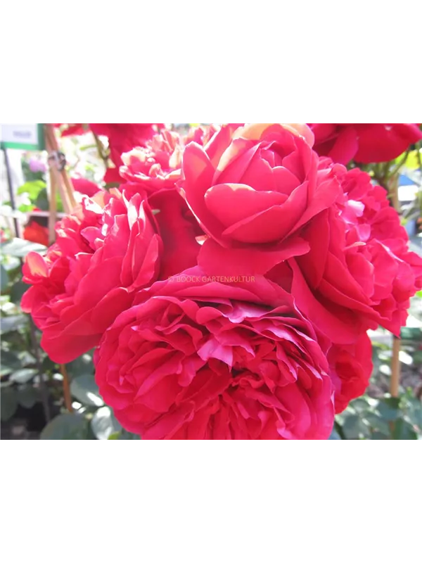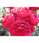 Die roten, schalenförmigen Blüten sind starkgefüllt und erscheinen von Juni bis Oktober. Diese werden etwa 8 - 10 cm groß und sind angenehm duftend.