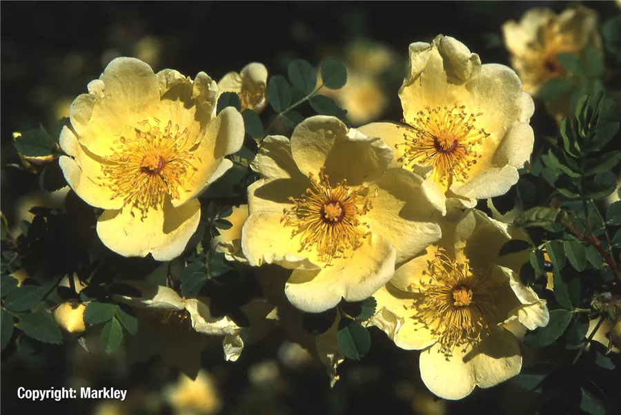 Die sommergrünen Blätter der Goldgelbe Rose sind dunkelgrün, gefiedert, wechselständig.