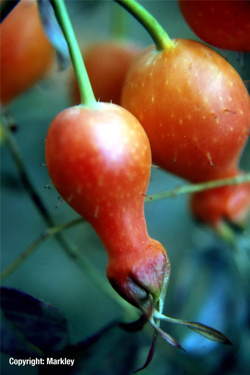 Besonders dekorativ sind die roten, länglichen Früchte von Rosa moyesii. Diese erscheinen ab September.