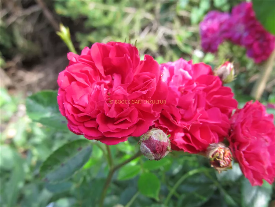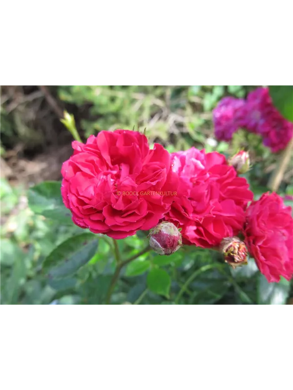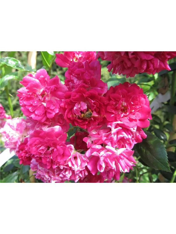 Die rosafarbenen, schalenförmigen Blüten sind starkgefüllt und erscheinen von Juni bis Oktober. Diese werden etwa 3 - 4 cm groß und sind angenehm duftend.