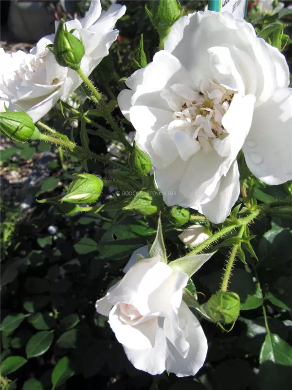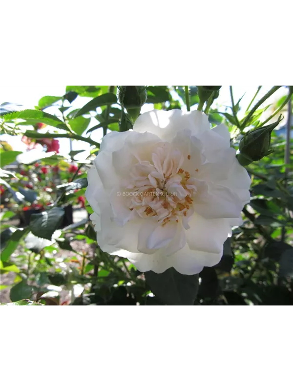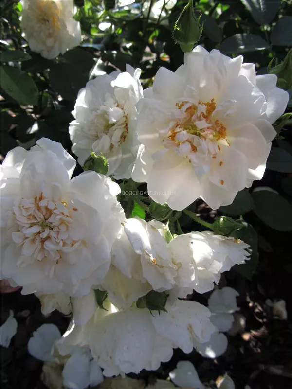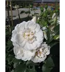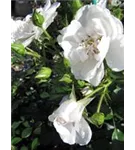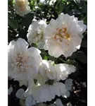 Die weißen, schalenförmigen Blüten sind halbgefüllt und erscheinen von Juni bis Oktober. Diese werden etwa 8 - 9 cm groß und sind leicht duftend.