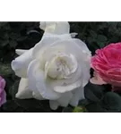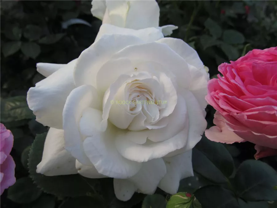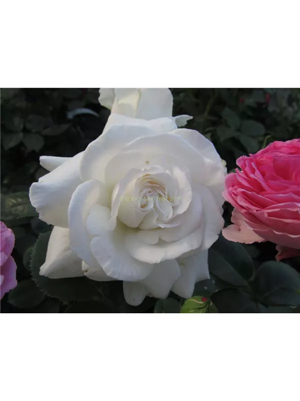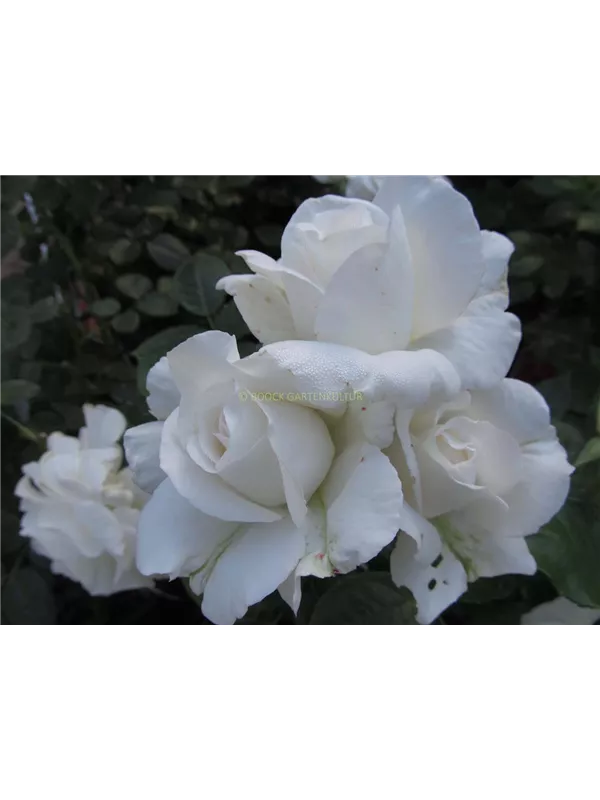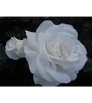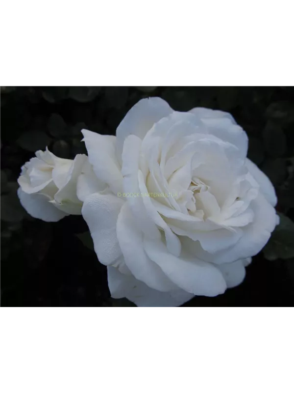 Die weißen, schalenförmigen Blüten sind gefüllt und erscheinen von Juni bis Oktober. Diese werden etwa 9 - 10 cm groß und sind stark duftend.