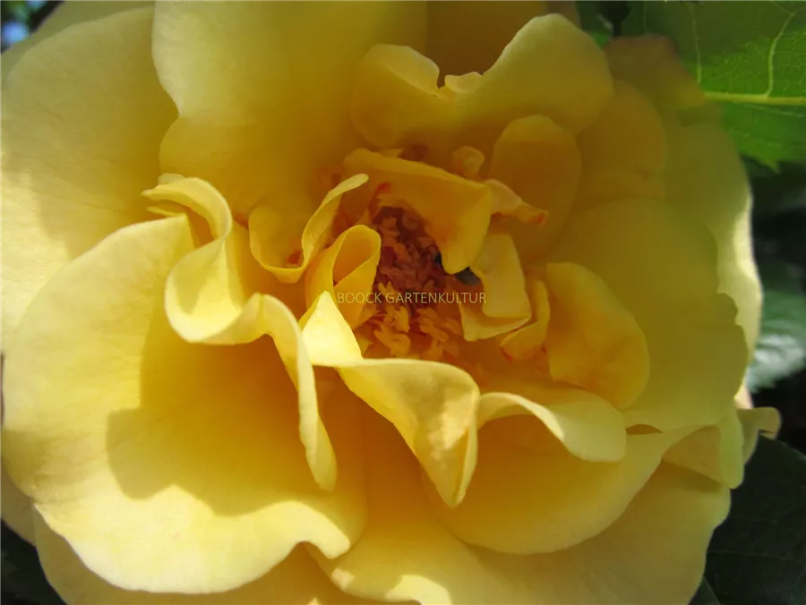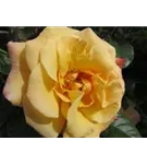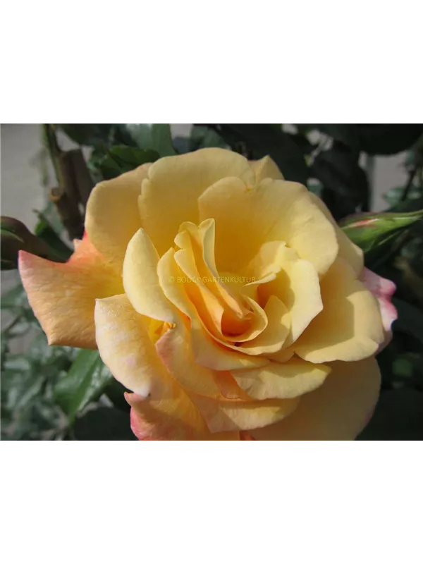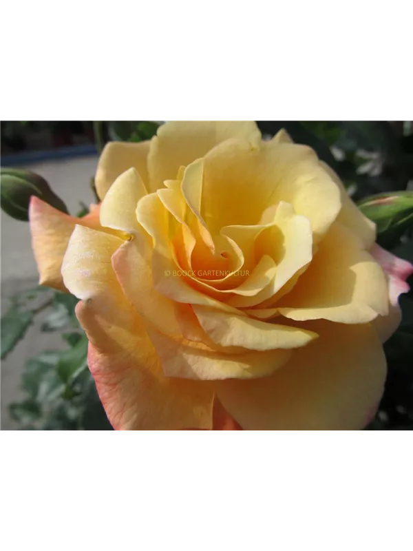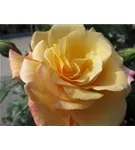 Die hellgelb-rosafarbenen, schalenförmigen Blüten sind halbgefüllt und erscheinen von Juni bis September. Diese werden etwa 10 - 12 cm groß und sind angenehm duftend.