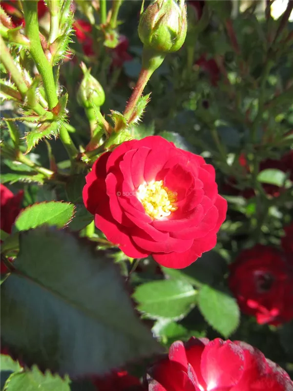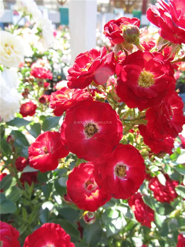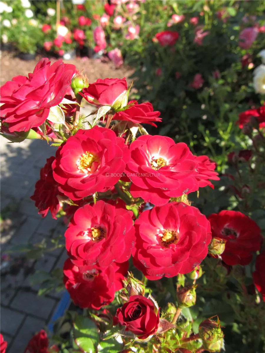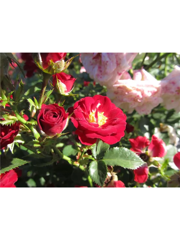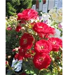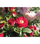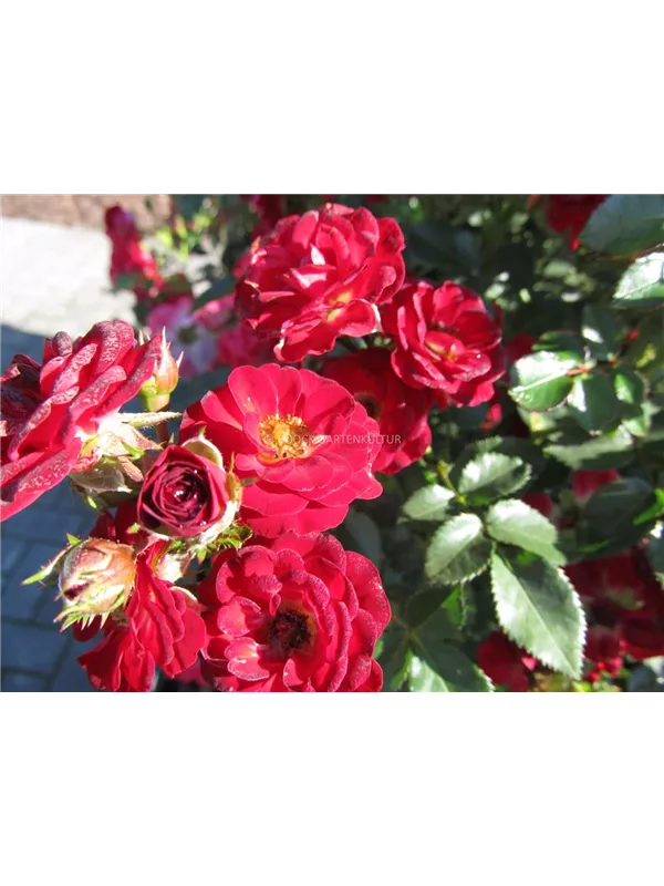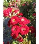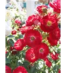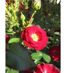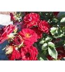 Die blutroten, halbgefüllten, schalenförmigen Blüten der Zwergrose 'Mandy'® erscheinen in Dolden von Juni bis Oktober. Diese werden etwa 2 - 3 cm groß.