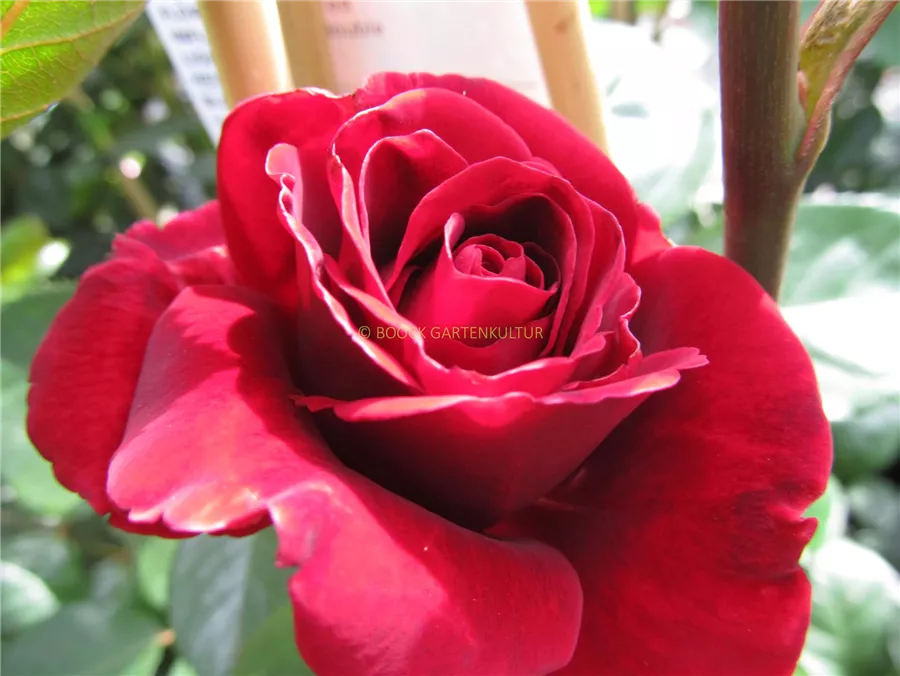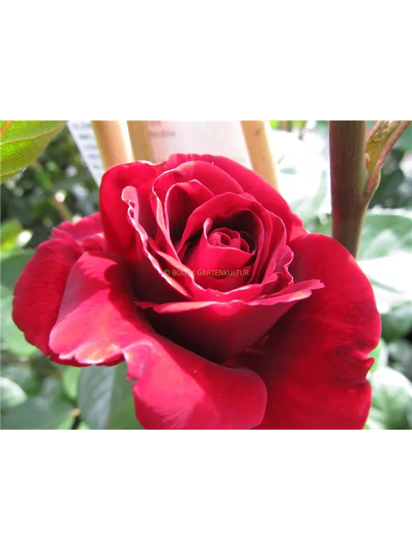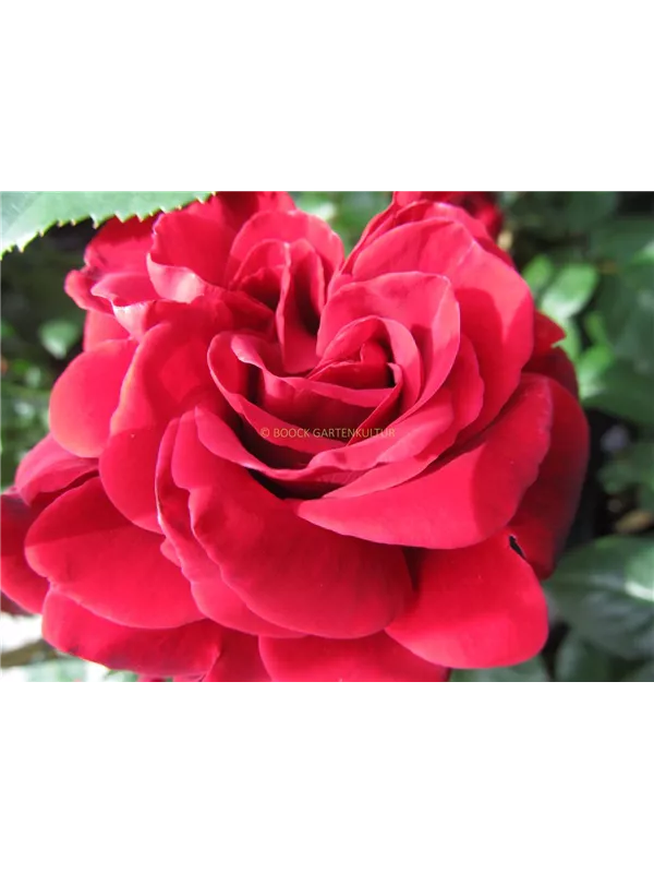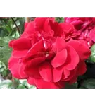 Die dunkelroten, schalenförmigen Blüten sind gefüllt und erscheinen von Juni bis Oktober. Diese werden etwa 9 - 10 cm groß und sind angenehm duftend.