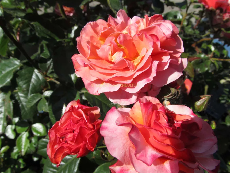 Die sommergrünen Blätter der Beetrose 'Marie Curie'® sind dunkelgrün, gefiedert, wechselständig.