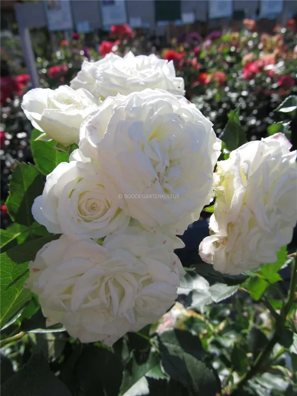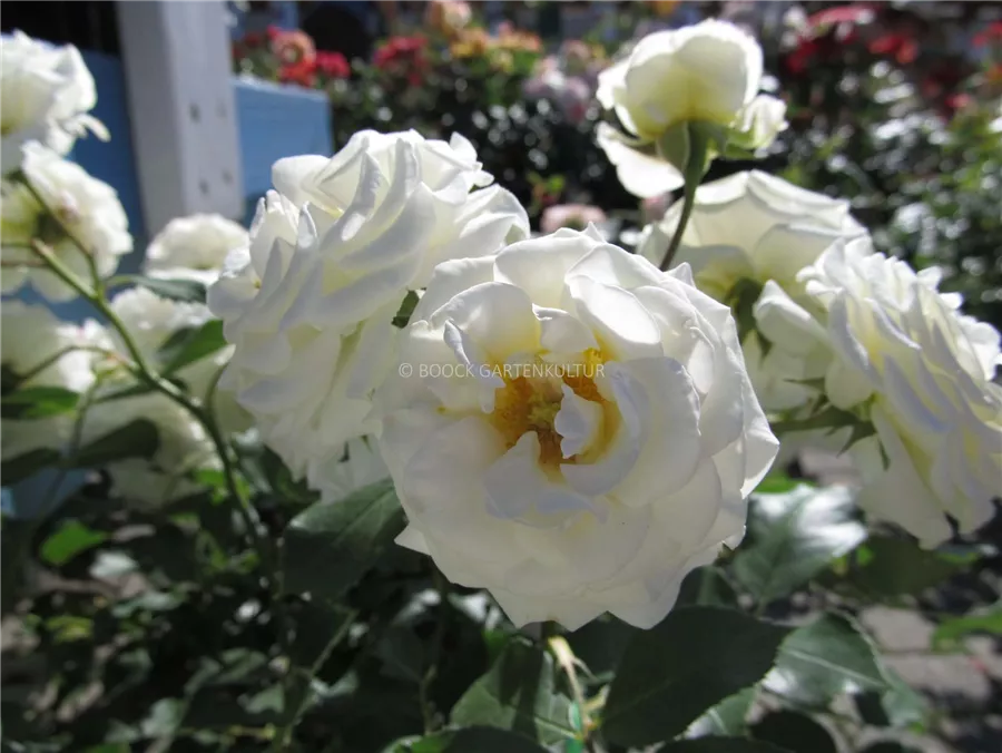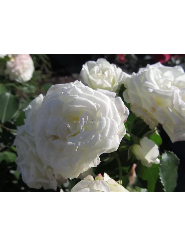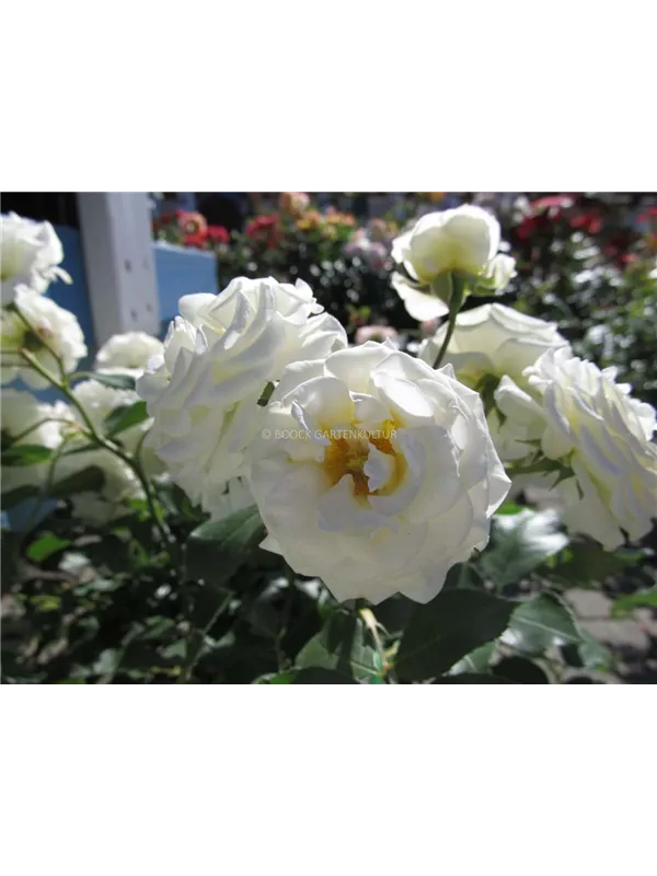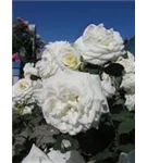 Die weißen, schalenförmigen Blüten sind starkgefüllt und erscheinen von Juni bis Oktober. Diese werden etwa 4 - 5 cm groß.