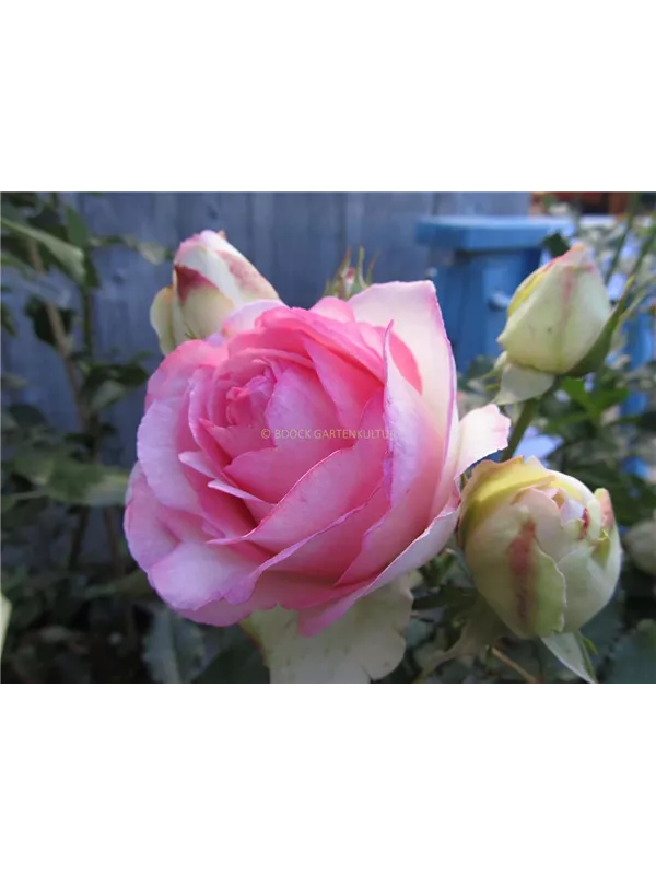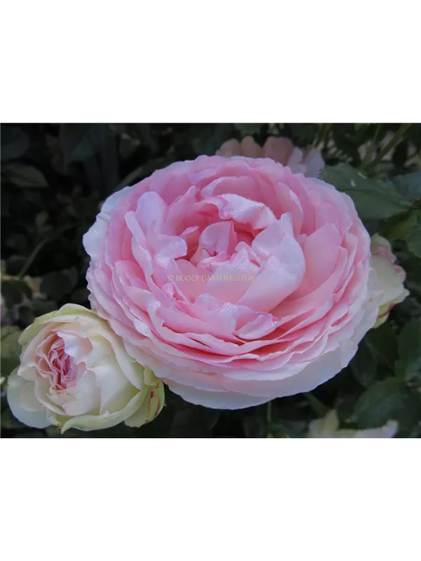 Die hellrosafarbenen, schalenförmigen Blüten sind starkgefüllt und erscheinen von Juni bis September. Diese werden etwa 8 - 10 cm groß und sind angenehm duftend.