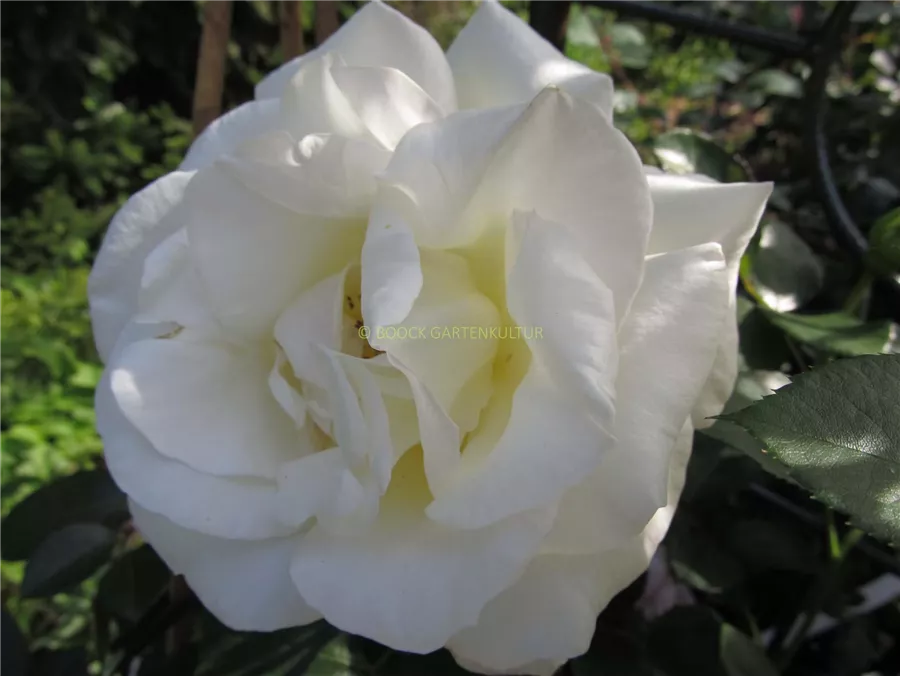 Die weißen, schalenförmigen Blüten sind gefüllt und erscheinen von Juni bis Oktober. Diese sind angenehm duftend.