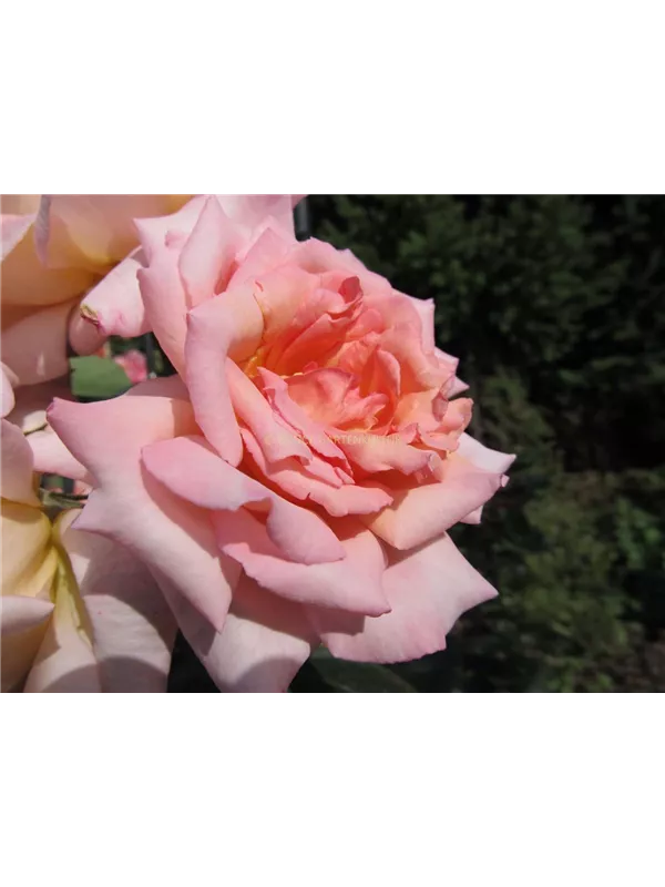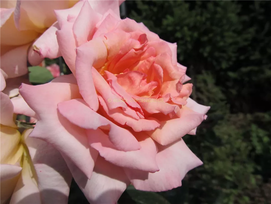 Die lachsrosafarbenen, schalenförmigen Blüten sind gefüllt und erscheinen von Juni bis Oktober. Diese sind stark duftend.
