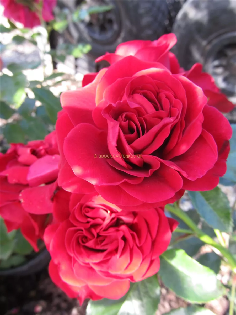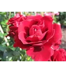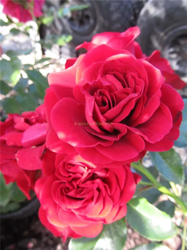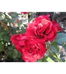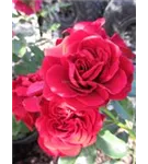 Die dunkelroten, schalenförmigen Blüten sind gefüllt und erscheinen von Juni bis Oktober. Diese sind angenehm duftend.
