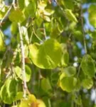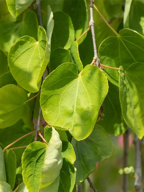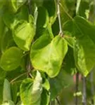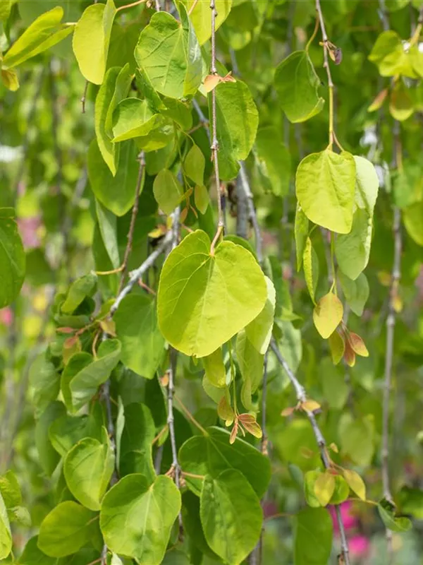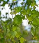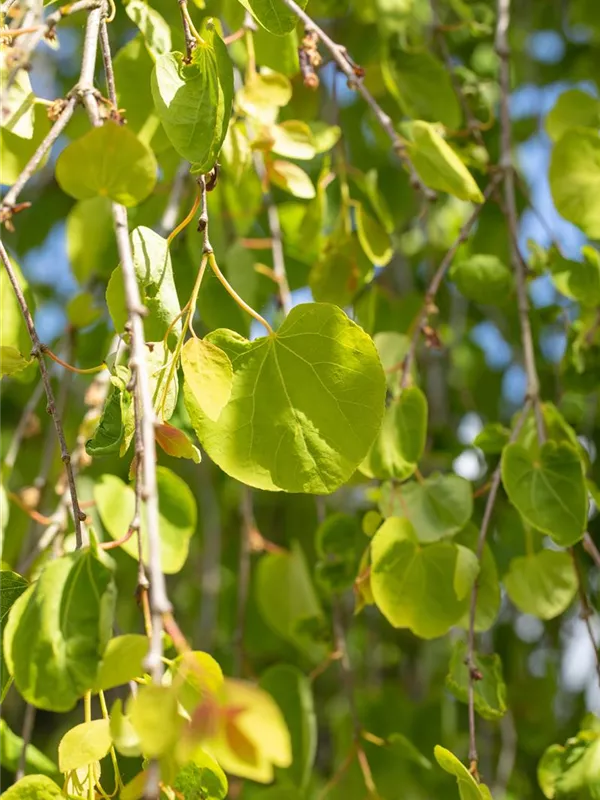 Die sommergrünen Blätter des Hängenden Katsurabaums 'Pendulum' sind matt, grün, rundlich. Kupferbrauner Austrieb. Hängender Katsurabaum 'Pendulum' zeigt sich leuchtend orangegelb im Herbst.