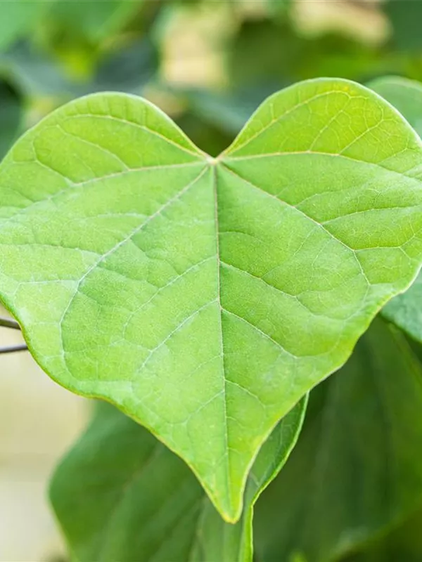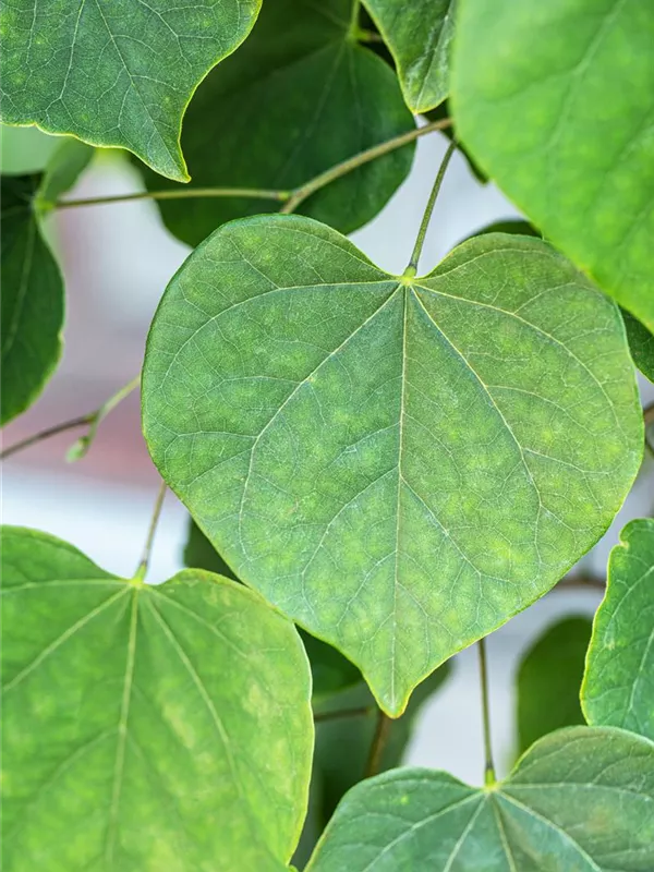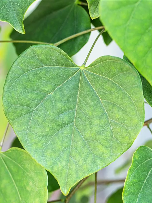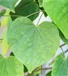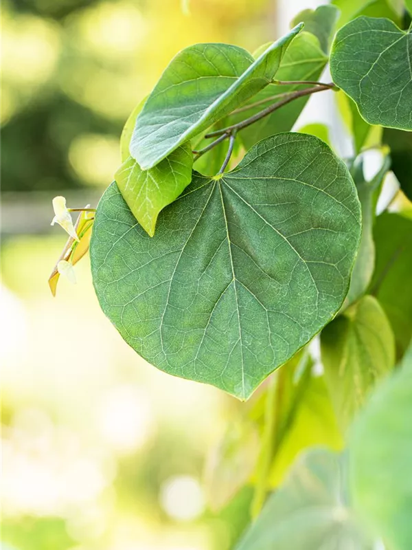 Die sommergrünen Blätter des Kanadischen Judasbaums 'Cascading Hearts' sind mittelgrün, herzförmig, wechselständig. Diese sind etwa 8 - 14 cm groß.