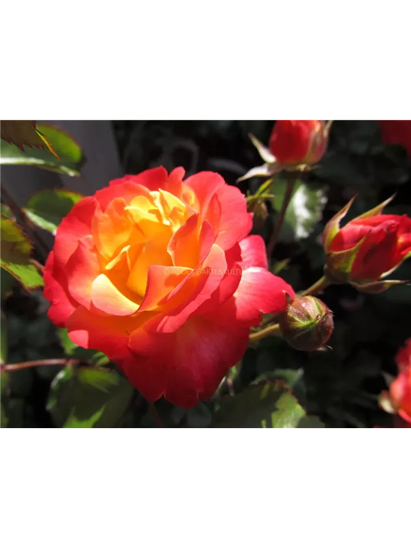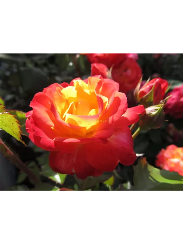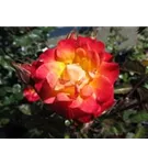 Die gelb-roten, gefüllten, schalenförmigen Blüten der Beetrose 'Firebird'® erscheinen in Dolden von Juni bis September. Diese werden etwa 6 - 7 cm groß.