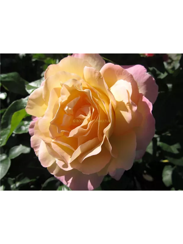 Die apricotfarbenen, schalenförmigen Blüten sind gefüllt und erscheinen von Juni bis Oktober. Diese werden etwa 10 - 12 cm groß und sind leicht duftend.