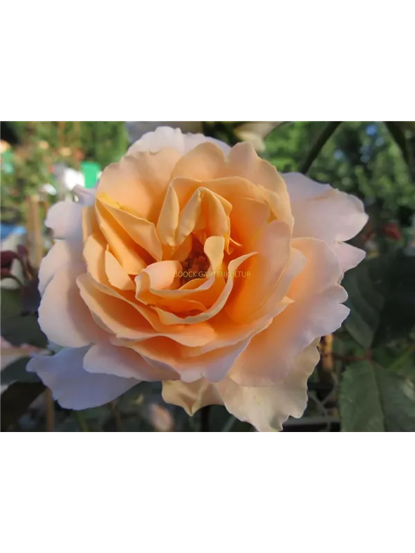 Die cremeweiß-rosafarbenen, schalenförmigen Blüten sind gefüllt und erscheinen von Juni bis Oktober. Diese werden etwa 8 - 10 cm groß und sind angenehm duftend.