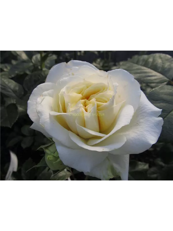 Die cremeweißen, schalenförmigen Blüten sind starkgefüllt und erscheinen von Juni bis Oktober. Diese sind angenehm duftend.