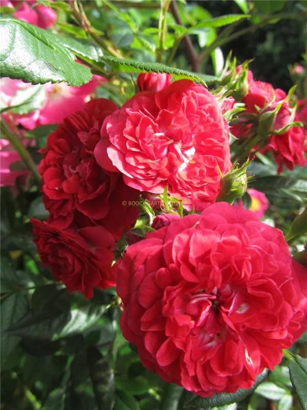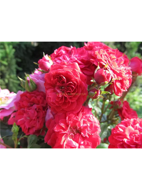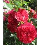 Die roten, schalenförmigen Blüten sind gefüllt und erscheinen von Juni bis Oktober. Diese werden etwa 2 - 4 cm groß und sind angenehm duftend.