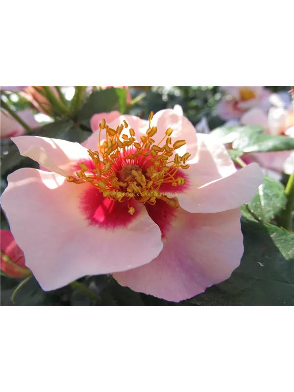 Die sommergrünen Blätter der Persische Rose 'SEE YOU® in red' sind dunkelgrün, gefiedert, wechselständig.