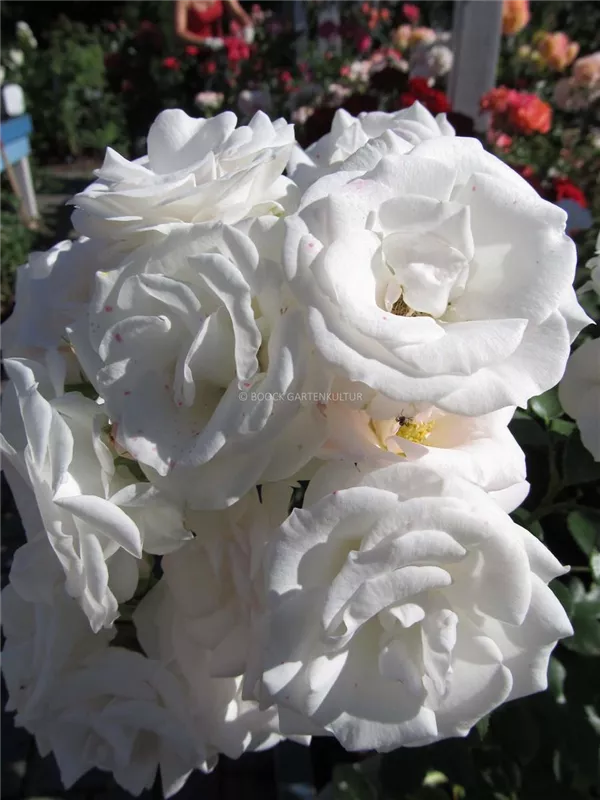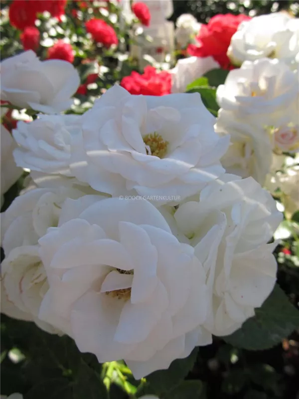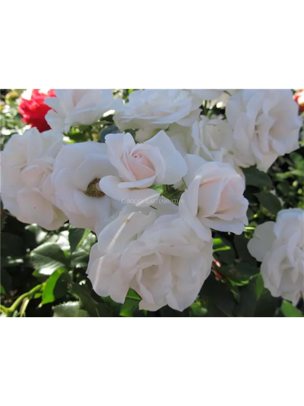 Die weißen Blüten sind gefüllt und erscheinen von Juni bis September. Diese werden etwa 4 - 6 cm groß und sind angenehm duftend.