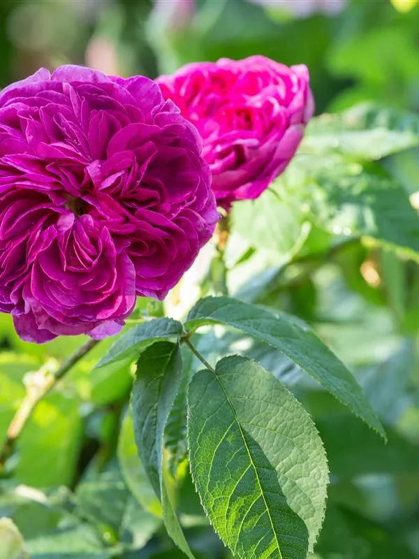 Die sommergrünen Blätter der Essigrose 'Charles de Mills' sind dunkelgrün, gefiedert, wechselständig.