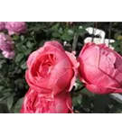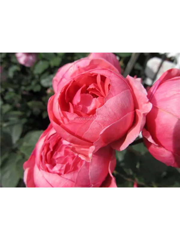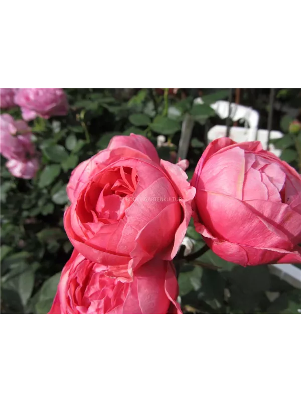 Die rosa-roten, starkgefüllten, schalenförmigen Blüten der Beetrose 'Gartenprinzessin Marie-José'® erscheinen in Dolden von Juni bis September. Diese werden etwa 5 - 6 cm groß und sind stark duftend.