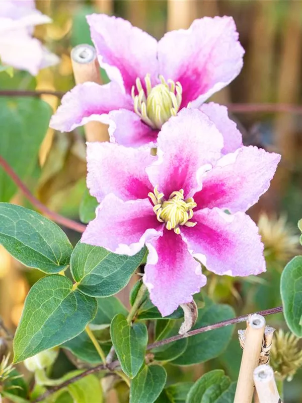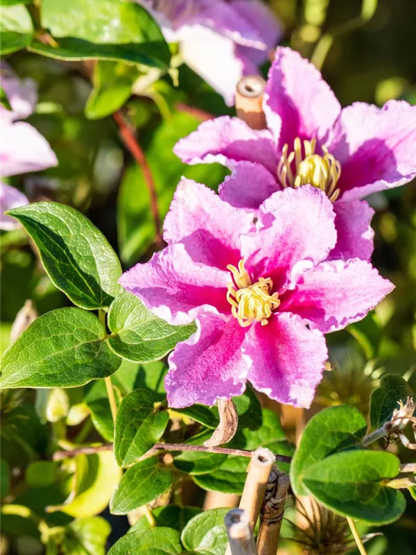 Die sommergrünen Blätter der Waldrebe 'Piilu' sind mittelgrün, gefiedert, gegenständig.
