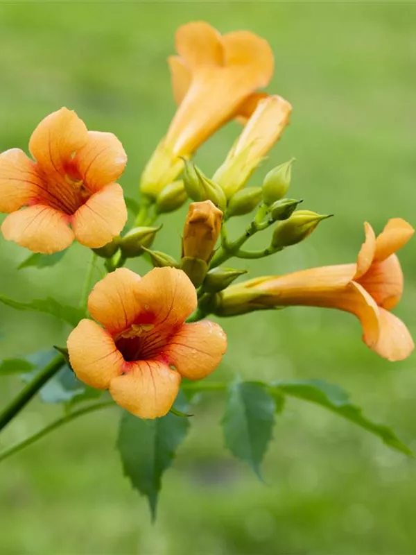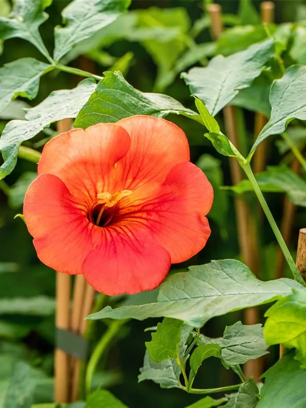 Die sommergrünen Blätter der Große Kletter-Trompetenblume 'Mme Galen' sind mittelgrün, gefiedert.