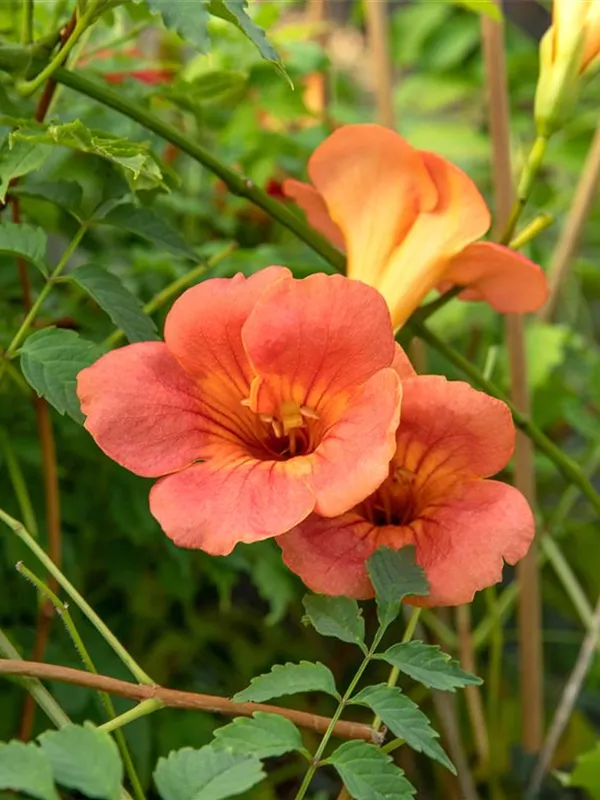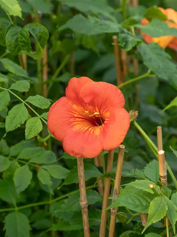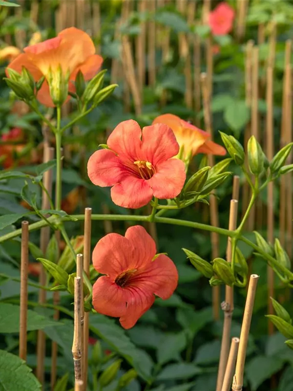 Die Große Kletter-Trompetenblume 'Mme Galen' setzt schöne Akzente gemeinsam mit: