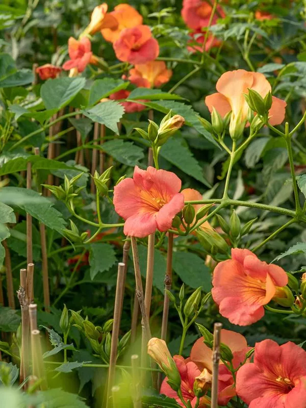 Große Kletter-Trompetenblume 'Mme Galen' ist ein Klettergehölz, welches eine Höhe von 4 - 6 m und eine Breite von 3 - 4 m erreichen kann. Langsam wachsend. In der Regel wächst sie 40 - 50 cm pro Jahr.