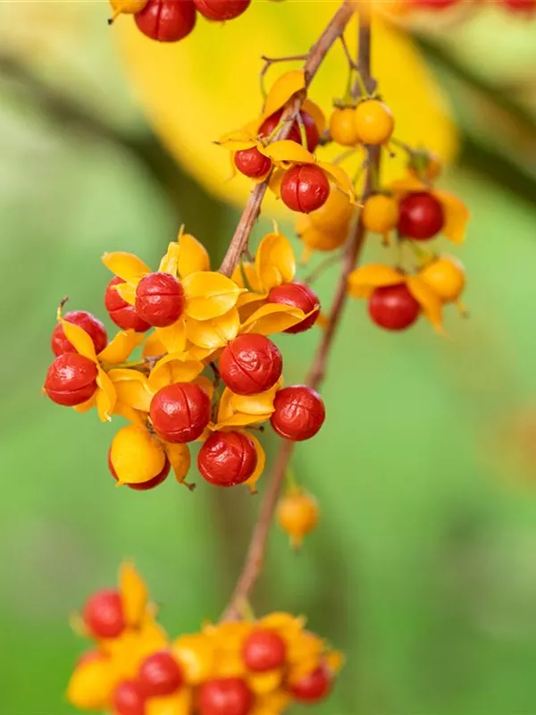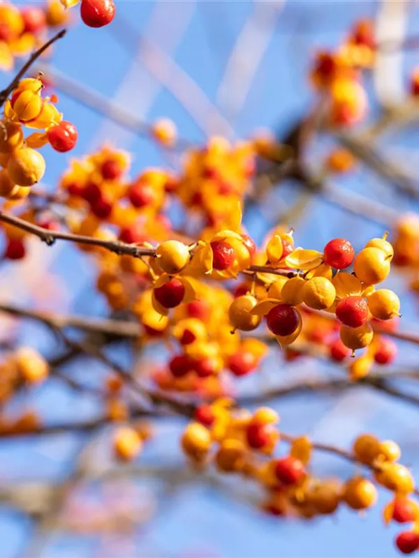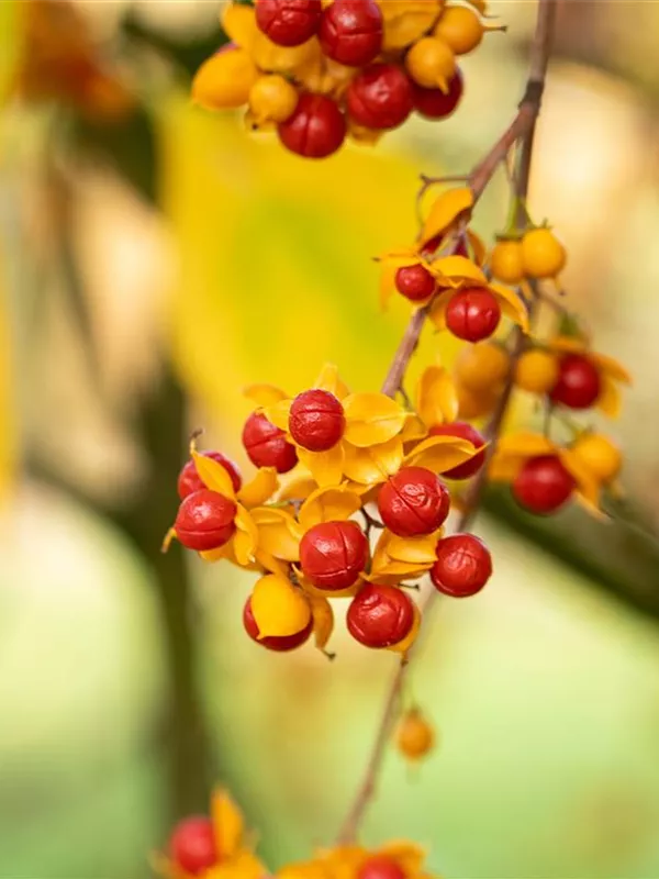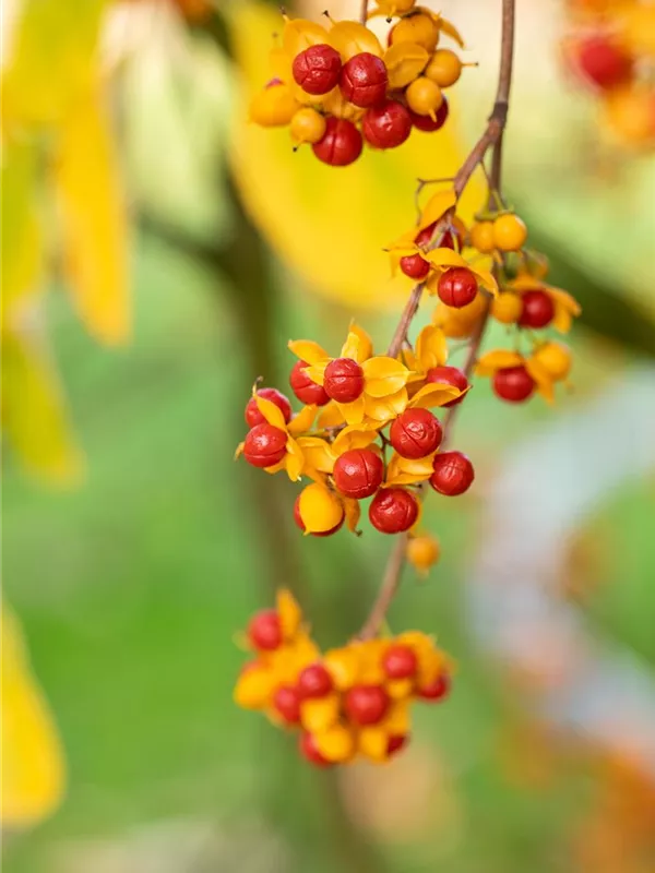Besonders dekorativ sind die gelb-roten Beeren von Celastrus orbiculatus. Diese erscheinen ab September.