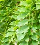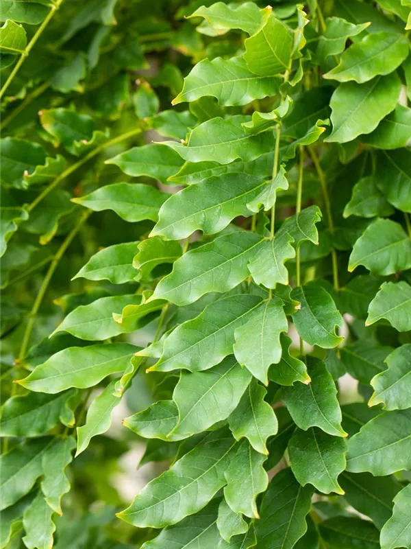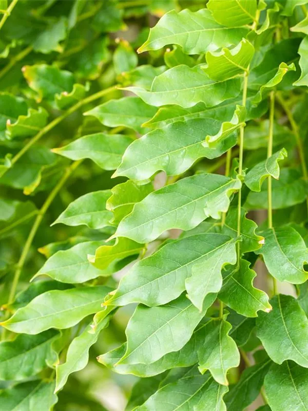 Die sommergrünen Blätter des Edelblauregens 'Macrobotrys' sind mittelgrün, gefiedert, wechselständig. Edelblauregen 'Macrobotrys' zeigt sich leuchtend gelb im Herbst.