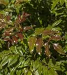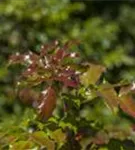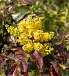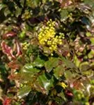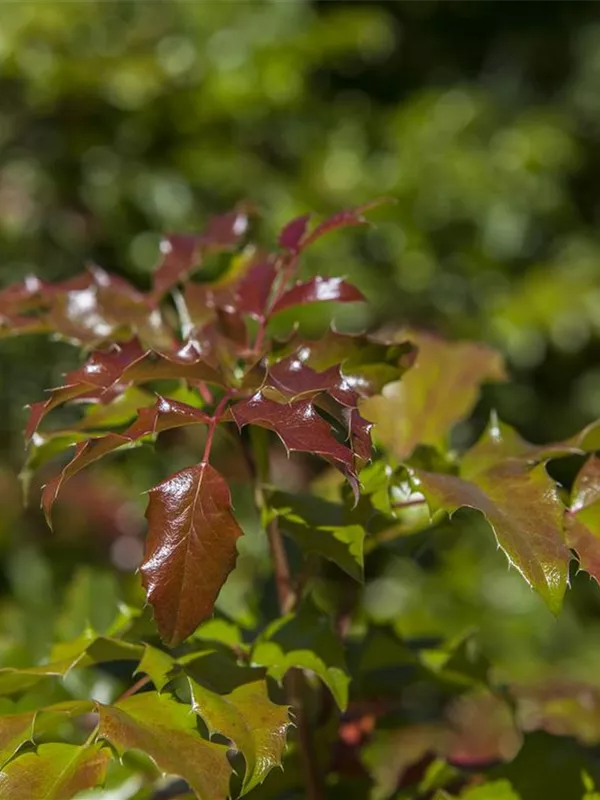 Die immergrünen Blätter der Gewöhnliche Mahonie sind dunkelgrün, gefiedert, wechselständig, gezähnt. Diese sind etwa 2 - 3 cm groß. Kupferbrauner Austrieb. Mit seinem rot-braunen Laub setzt sie schöne Akzente im Winter.