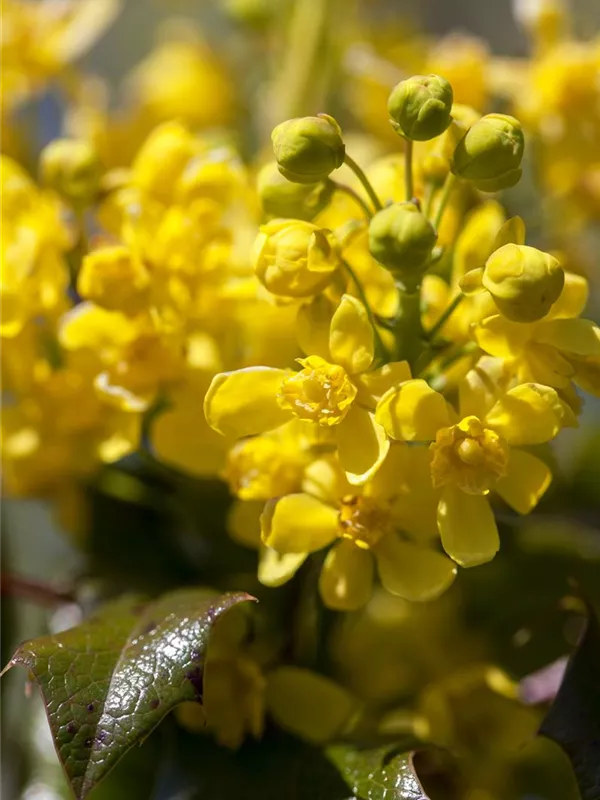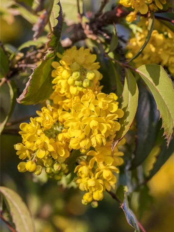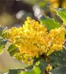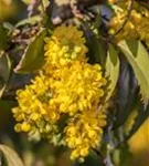 Die gelben Blüten der Gewöhnlichen Mahonie erscheinen in Trauben von April bis Mai. Diese sind angenehm duftend.