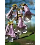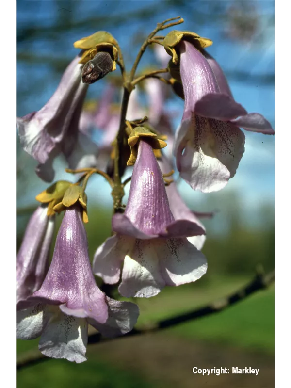 Die lilafarbenen, trichterförmigen Blüten des Blauglockenbaum erscheinen in Rispen von April bis Mai. Diese werden etwa 20 - 30 cm groß und sind angenehm duftend.