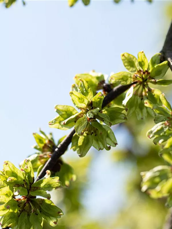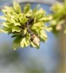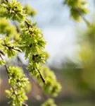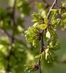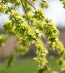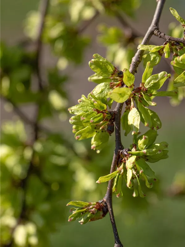 Die purpurvioletten Blüten der Laubenulme 'Pendula' erscheinen in Trugdolden von März bis April.