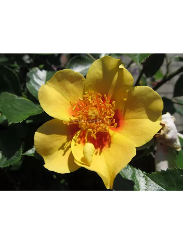Die Triebe von Rosa persica 'Queen of Sheba' sind bestachelt.