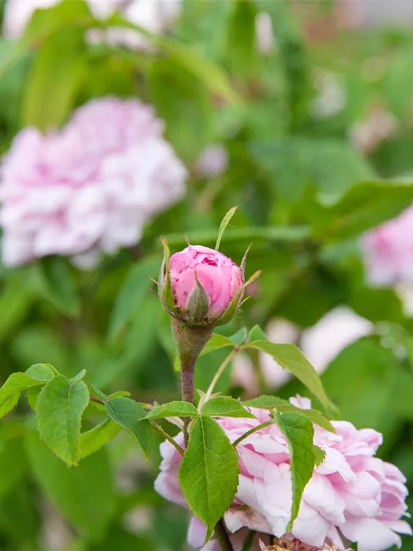 Die Triebe von Rosa x damascena 'Jacques Cartier' sind bestachelt.