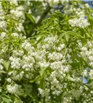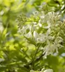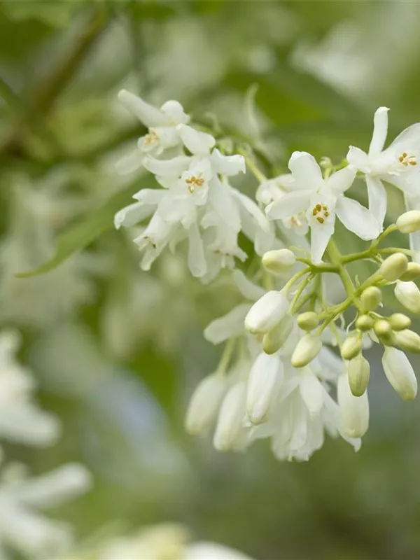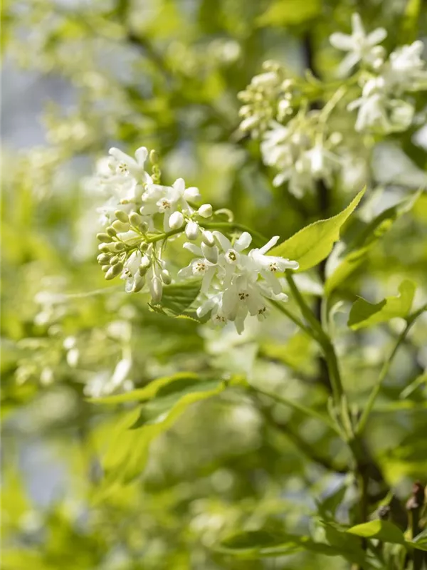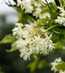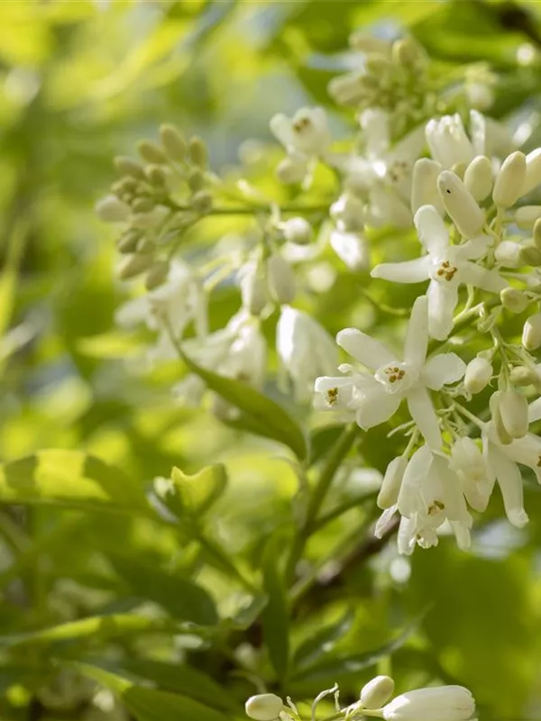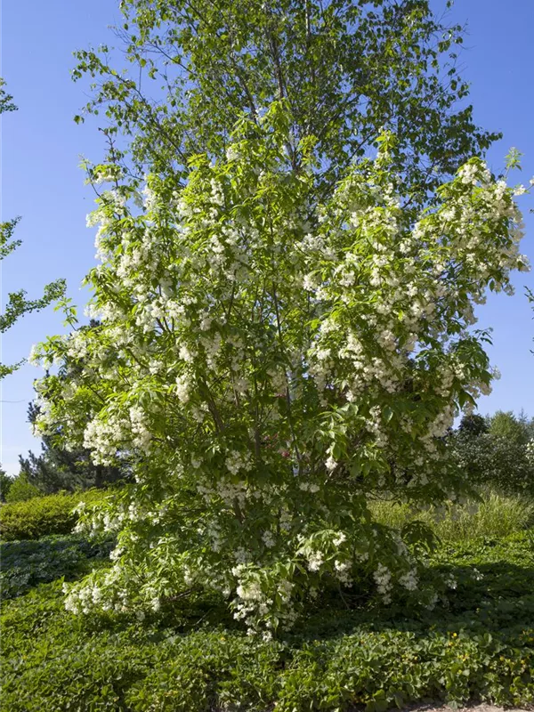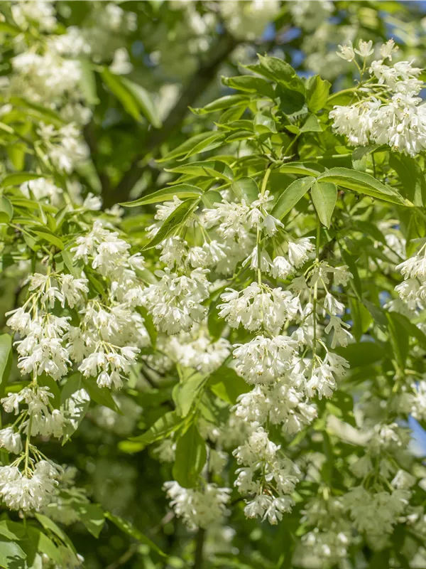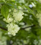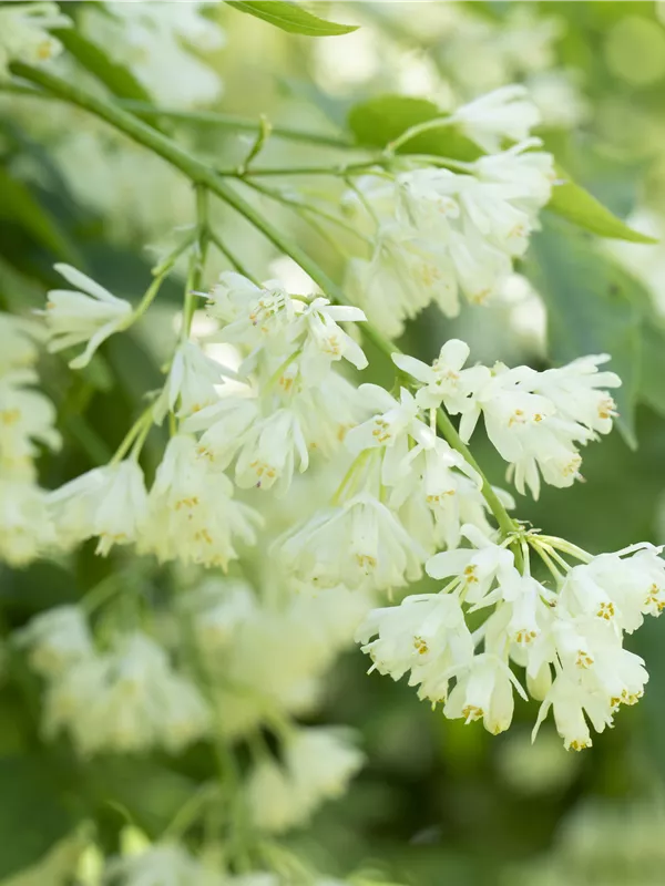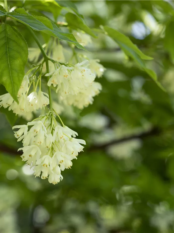 Die cremeweißen, glockenförmigen Blüten der Kolchischen Pimpernuss erscheinen in Rispen im Mai. Diese sind angenehm duftend.