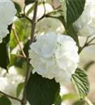 Die weißen, gefüllten Blüten des Japanischen Schneeball 'Rotundifolium' erscheinen in Trugdolden von Mai bis Juni. Diese sind stark duftend.