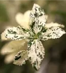Die immergrünen Blätter der Kriechspindel 'Harlequin' sind weißbunt, rundlich. Diese sind etwa 5 - 6 cm groß. Kriechspindel 'Harlequin' zeigt sich leuchtend rot im Herbst.