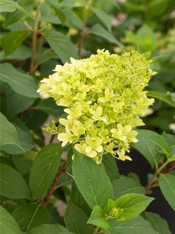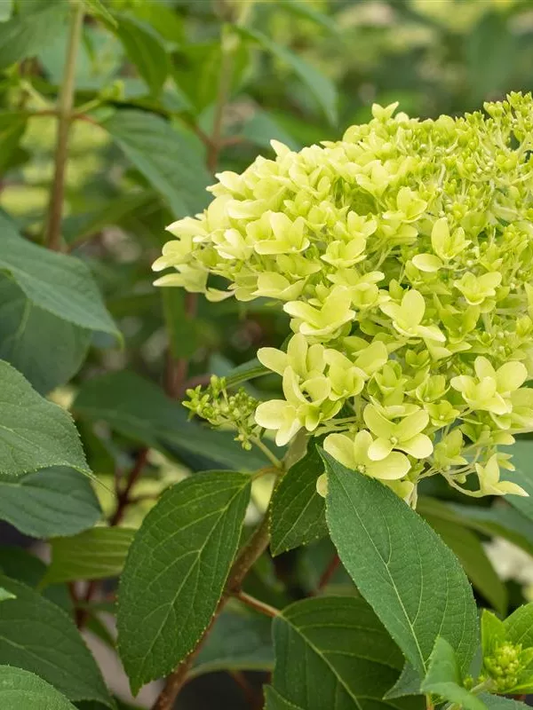 Die sommergrünen Blätter der Rispenhortensie 'Skyfall' sind mittelgrün, breit lanzettlich.