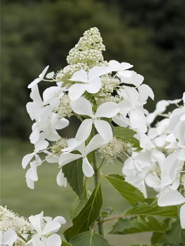 Die weißen, sternförmigen Blüten der Rispenhortensie 'Skyfall' erscheinen in Rispen von Juli bis September. Diese sind angenehm duftend.