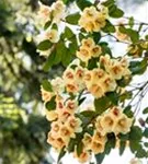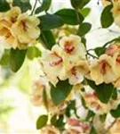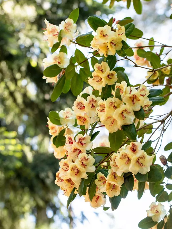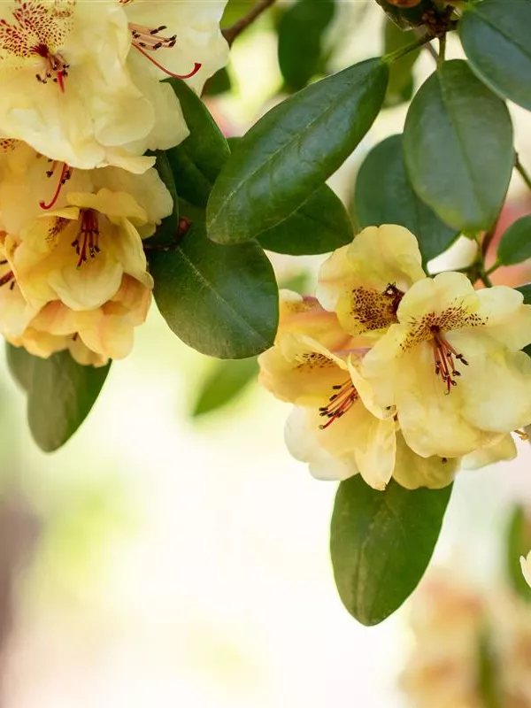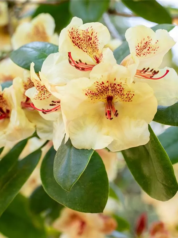 Rhododendron 'Viscy' bildet von Anfang Mai bis Ende Mai zahlreiche trichterförmige, in Dolden angeordnete, orangegelbe Blüten mit gelbroter Zeichnung.