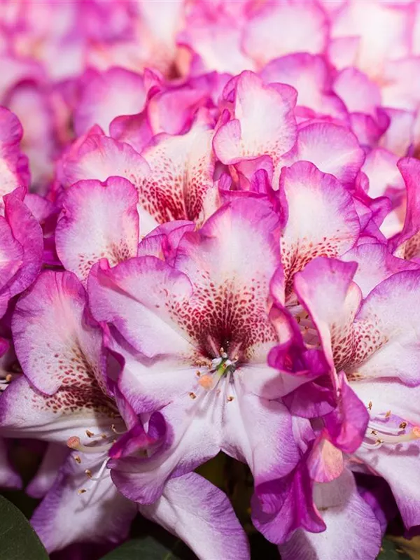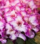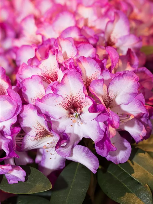 Rhododendron 'Hans Hachmann'® bildet von Mai bis Juni zahlreiche trichterförmige, in Dolden angeordnete, mehrfarbige Blüten.