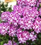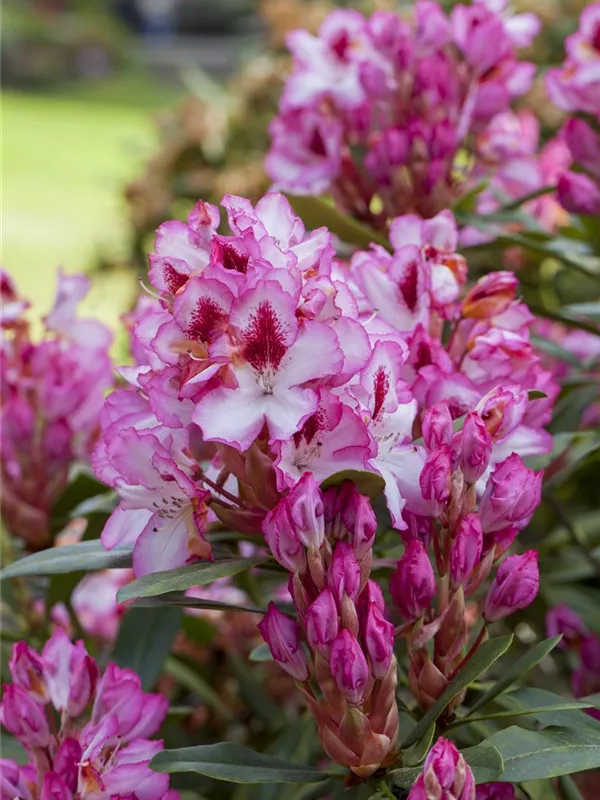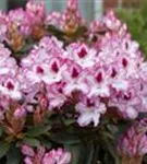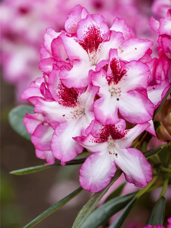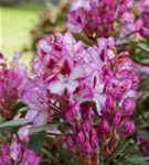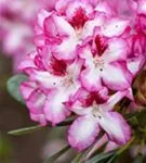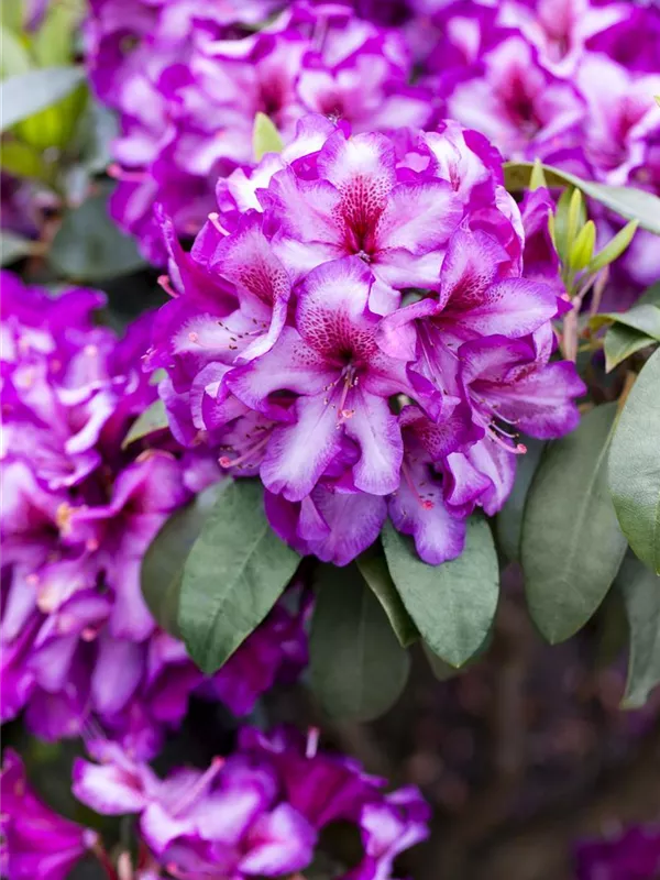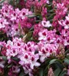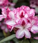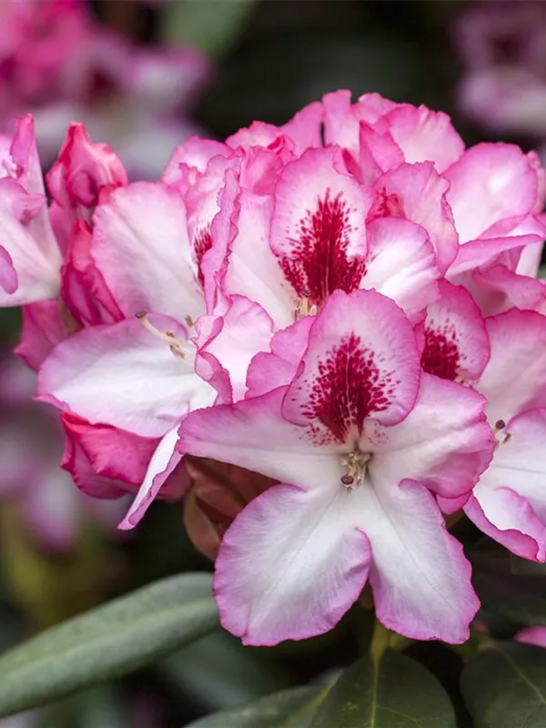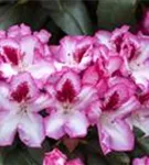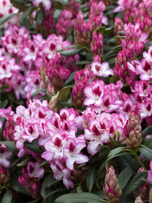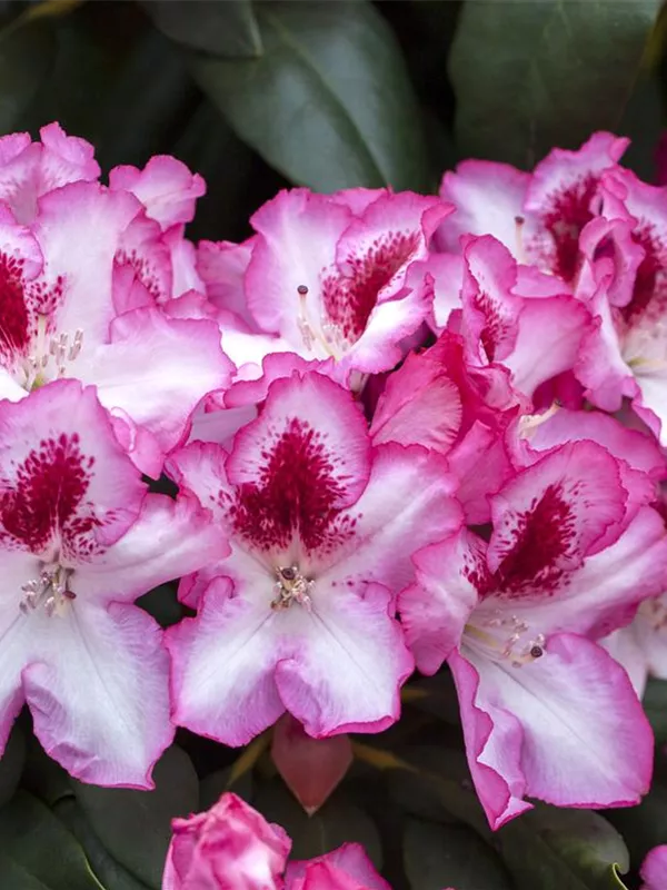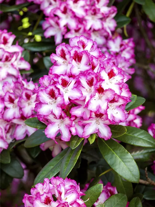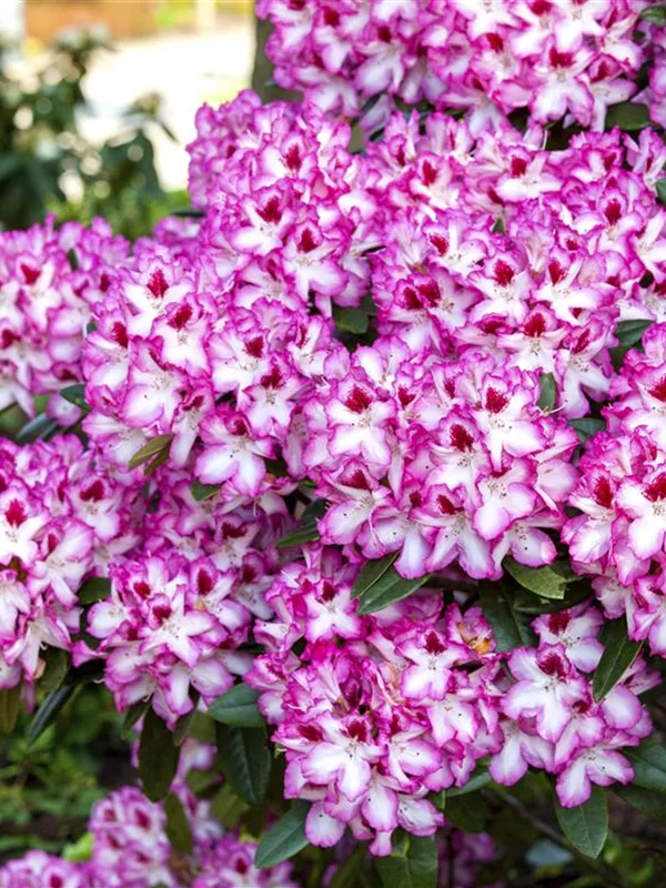 Rhododendron 'Hachmann´s Charmant'(s) bildet von Anfang Mai bis Mitte Juni zahlreiche trichterförmige, in Dolden angeordnete, zweifarbige Blüten.